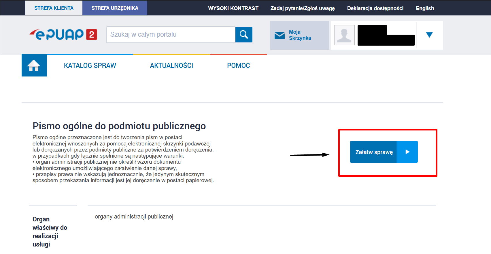 Нажмите „Załatw sprawę” (Решить дело / отправить письмо)