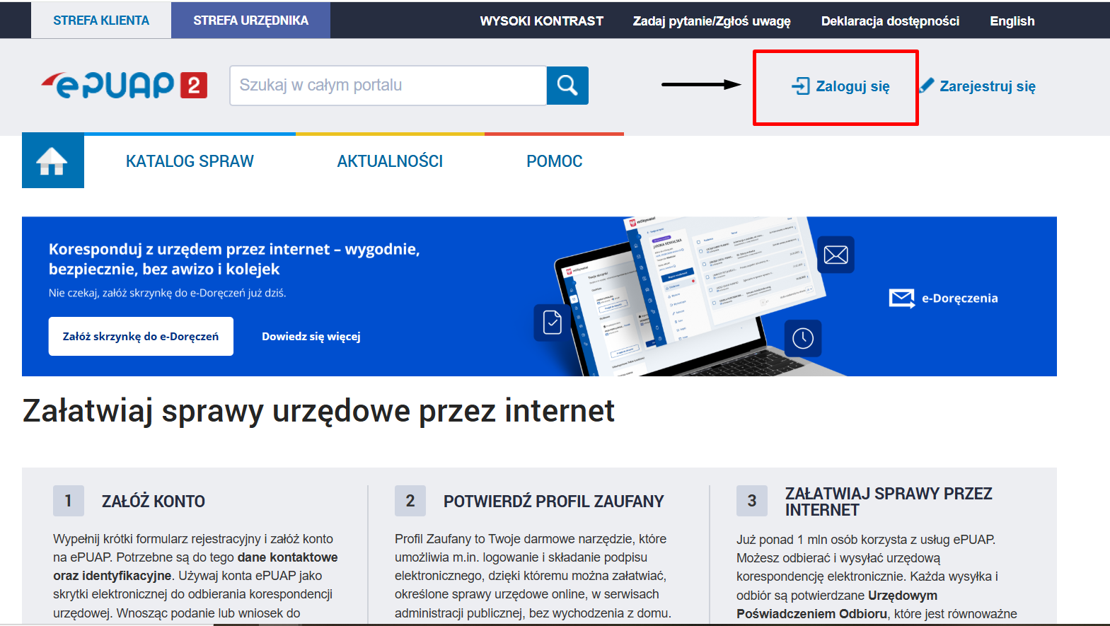 Для входа используется Profil Zaufany — подтверждённая электронная подпись, которая заменяет личное присутствие в офисе.