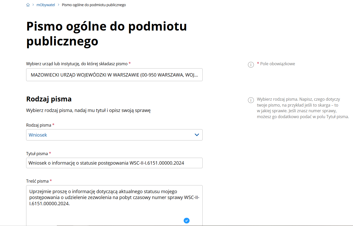 - В поле „Rodzaj pisma” — выбрать тип письма (заявление, жалоба, информация или другое письмо)