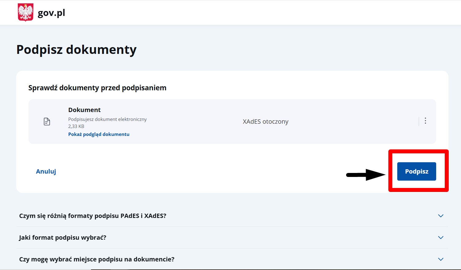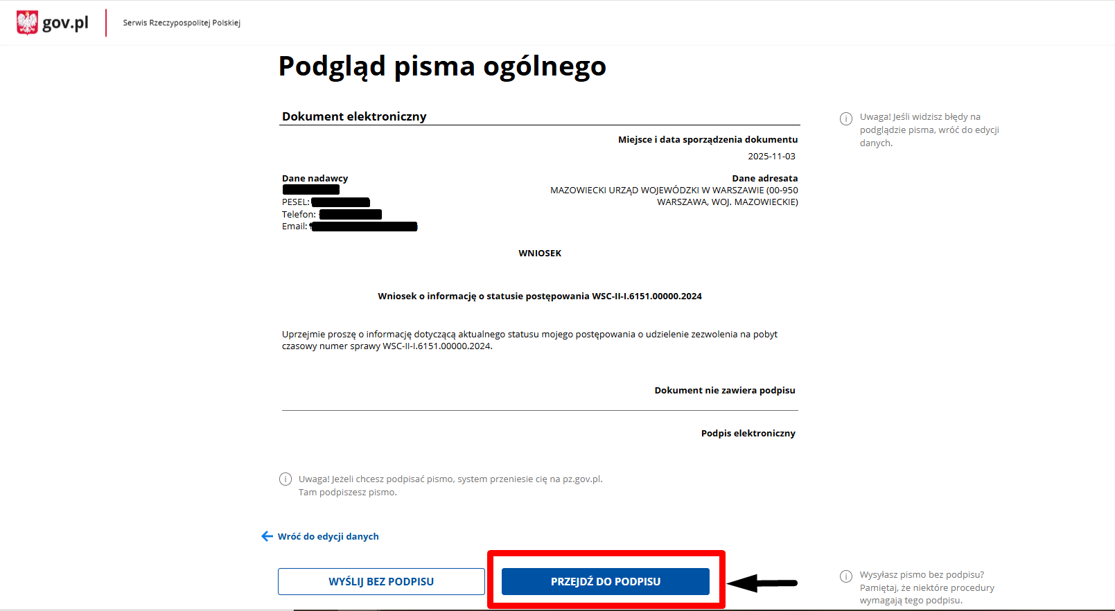 - Проверьте указанные данные в письме и нажмите „Przejdź do podpisu” и „Podpisz”.