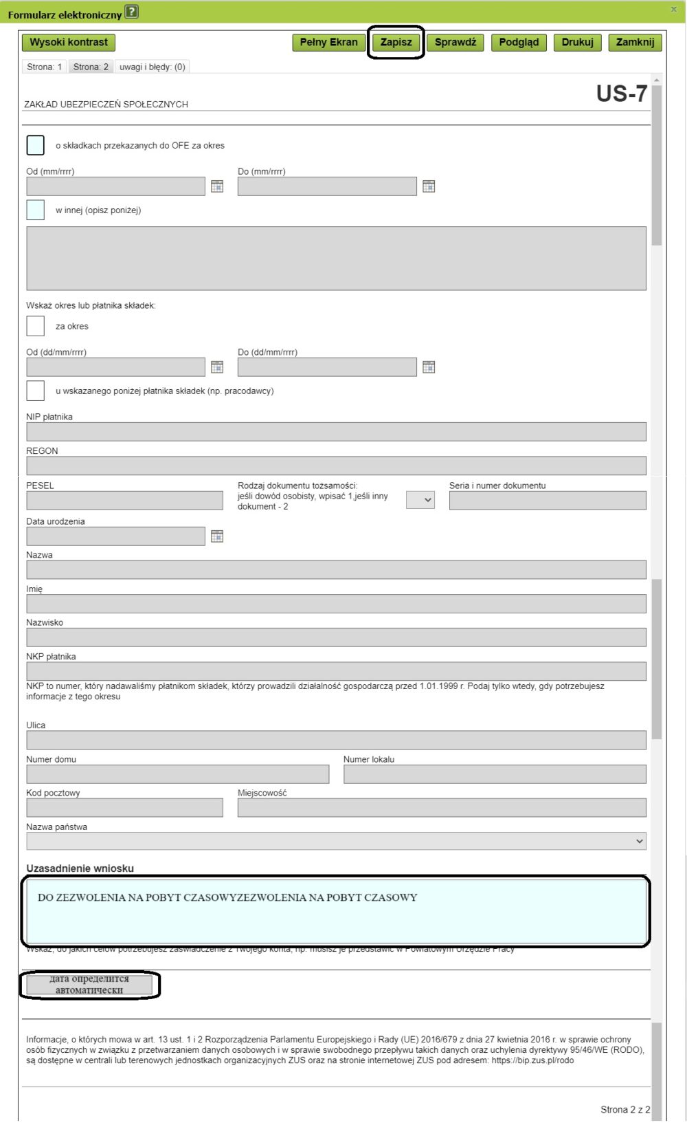 ШАГ 9. На следующей странице (страница 2 формуляра) заполняем только поле «Uzasadnenie wniosku» информацией о цели получения справки — «DO ZEZWOLENIA NA POBYT CZASOWY» и далее вверху формы жмём на кнопку «Zapisz»