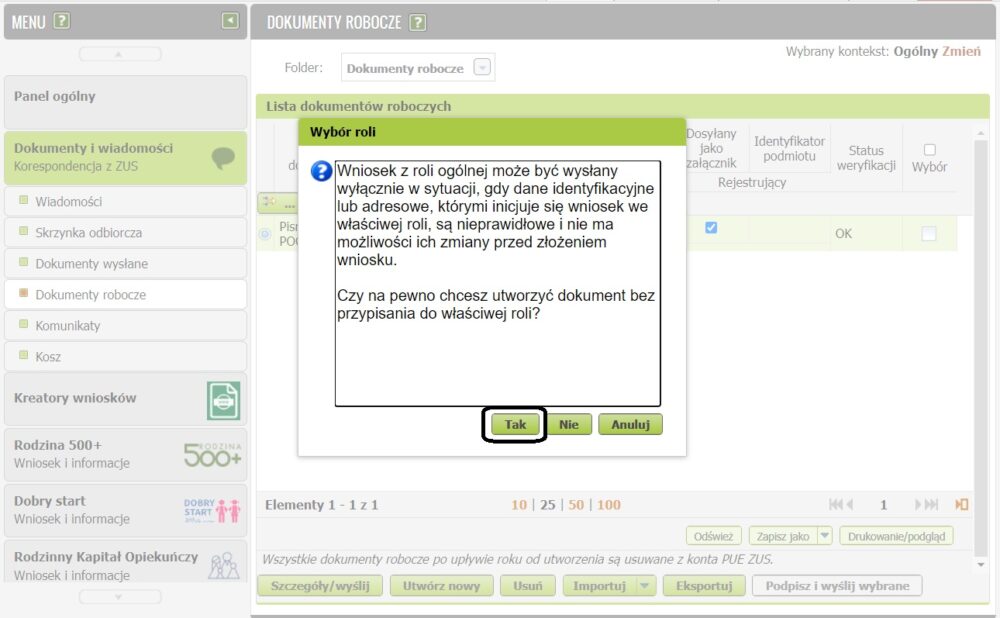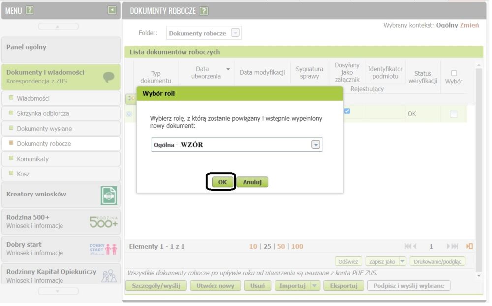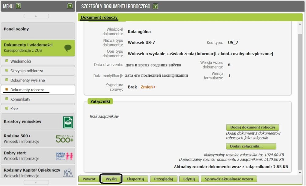 ШАГ 11. После записи и закрытия формуляра он сохраняется на портале PUE-ZUS в разделе «Dokumenty robocze» и для его отправки на рассмотрение в ZUS необходимо нажать «Wyślij»