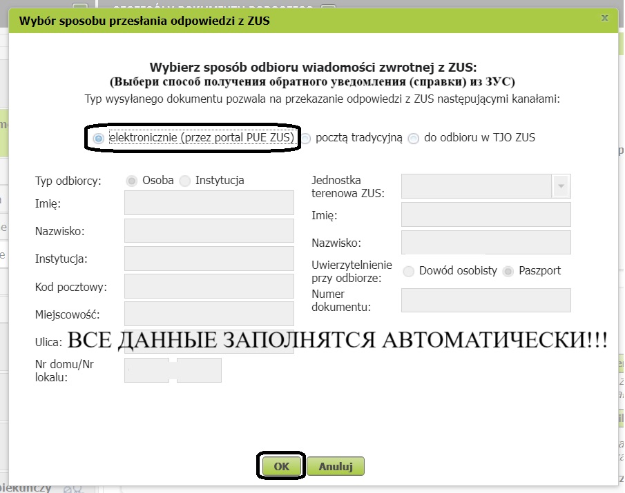 ШАГ 12. На следующем шаге Вам будет предложен вариант получения справки (электронный вариант, традиционное письмо или лично). Выбираем «elektroniczne (przezportal PUE ZUS)» жмём «ОК»