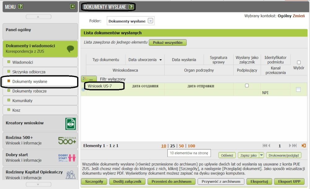 ШАГ 15. На данном этапе Ваше Заявление отправлено в ЗУС и на портале PUE-ZUS оно перемещается в раздел «Dokumenty wysłane» (Высланные документы). Теперь остаётся только ждать появления самой справки из ЗУС в Вашем личном кабинете на портале PUE-ZUS