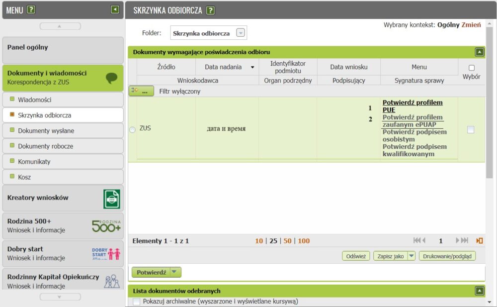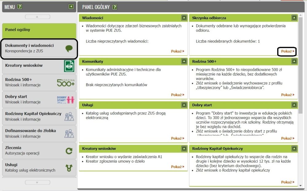 ШАГ 16. Уведомление о готовности справки придёт Вам в течении 1-2 рабочих дней посредством СМС-уведомления и (или) на e-mail, указанный при регистрации на портале PUE-ZUS. После получения уведомления в Вашем личном кабинете на портале PUE-ZUS перейдите в раздел «Dokumenty i wiadomości» и в подменю «Skrzynka odbiorcza» нажмите «Pokaż»