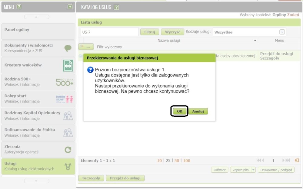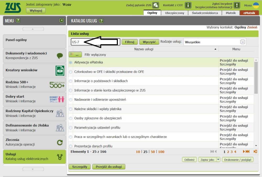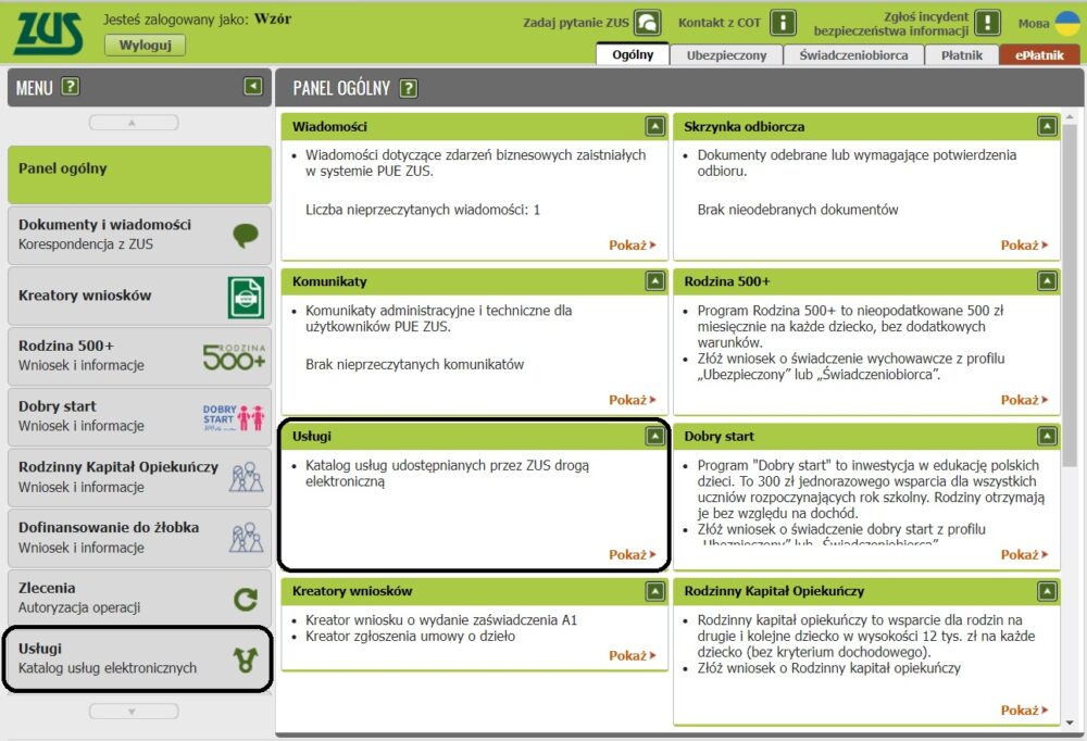 ШАГ 1. Заходим в свой личный кабинет на портале PUE-ZUS и выбираем в меню раздел «Usługi» (если у Вас ещё нет своего кабинета, то пошаговая инструкция по его регистрации приведена в нашей предыдущей статье (шаг 1-4))