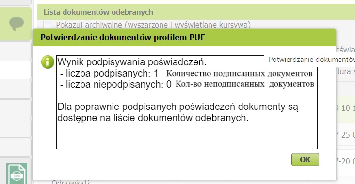 ШАГ 13. В следующем поле нужно выбрать тип цифровой подписи Заявления на получение справки (можно выбрать или профиль PUE или доверенный профиль (profil zaufany PUE) — выбираем «profil PUE» и жмём «ОК«