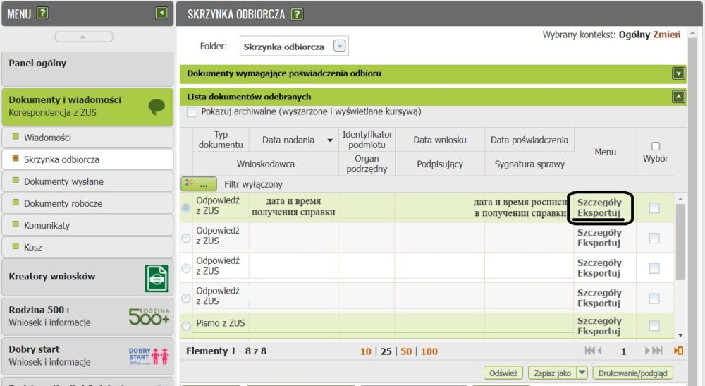 ШАГ 19. После подписи подтверждения получения Вами справки она будет доступна для скачивания, которое Вы можете сразу произвести путём нажатия клавиши «Eksportuj» расположенной в крайней правой ячейке строки содержащей информацию о полученной справке