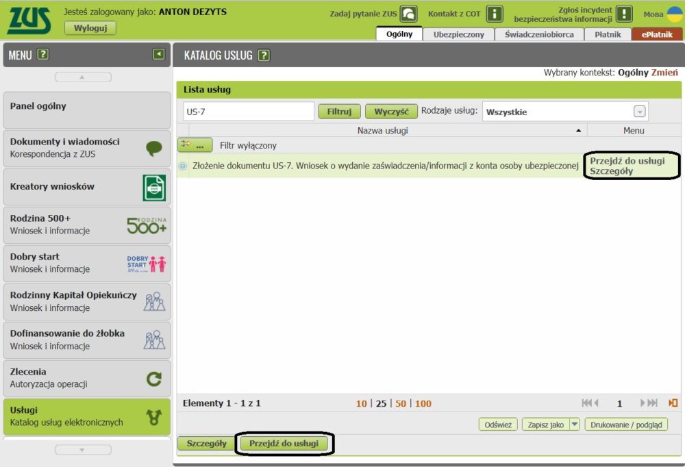ШАГ 3. После поиска на экране появится наименование справки, которая будет получена после подачи Заявления посредством заполнения формуляра US-7. Жмём «Przejdź do usługi» либо справа от сообщения либо внизу формы поиска