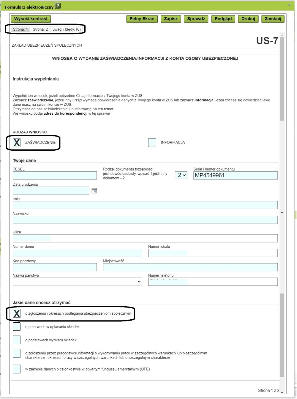 ШАГ 8. На следующей странице (страница 1 формуляра) ставим галочки в поле «ZAŚWIADCZENIE» и «o zgłoszeniu i okresach podlegania ubezpeczeniom społecznym». Остальные поля заполнятся информацией ранее указанной на шаге 7. После заполнения жмём на вкладку «Strona 2» в левом верхнем углу формы